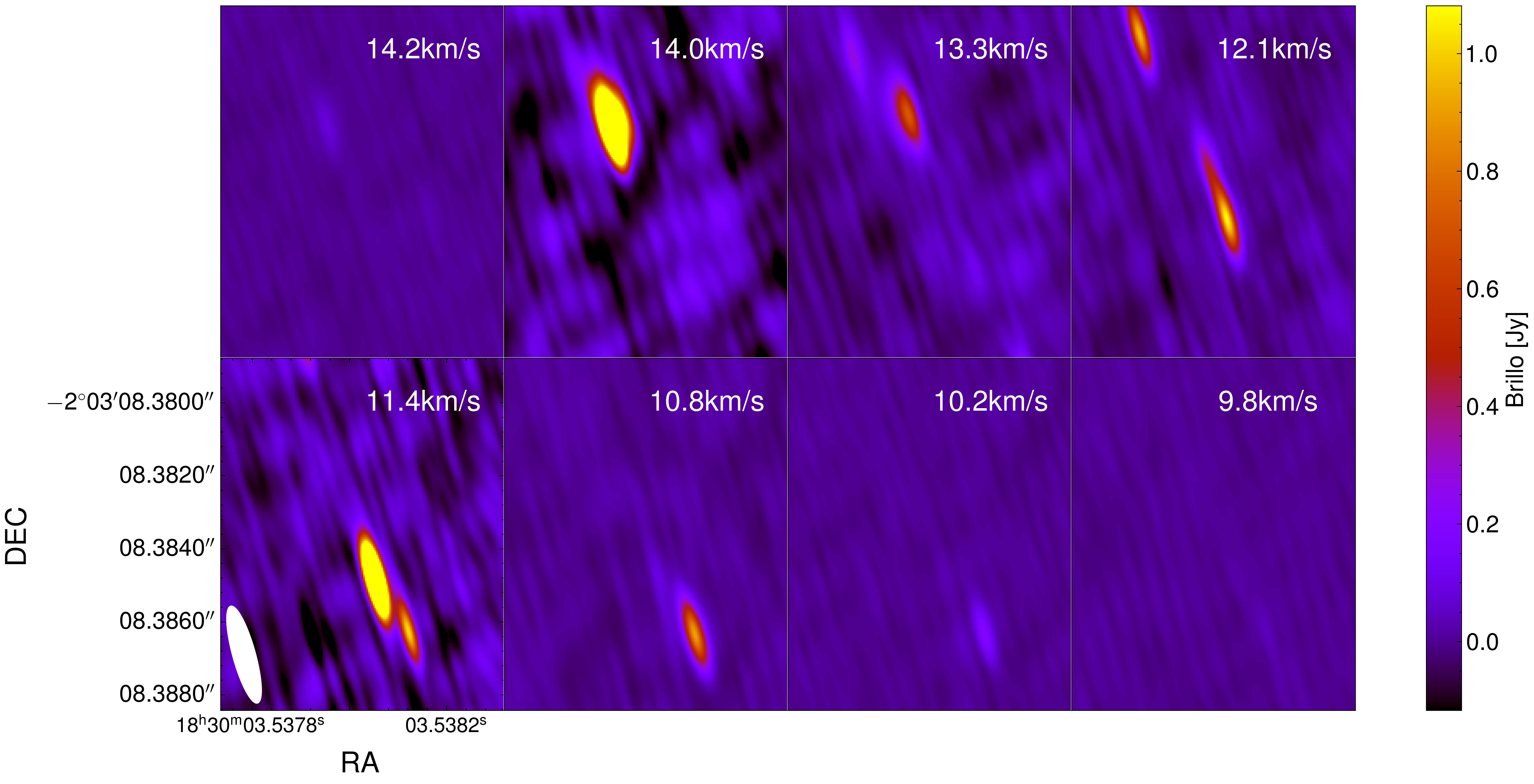 Detections of water masers on different velocity channels (rest velocity is 12.5km/s). Figure from CARMA 6 on epoch D.